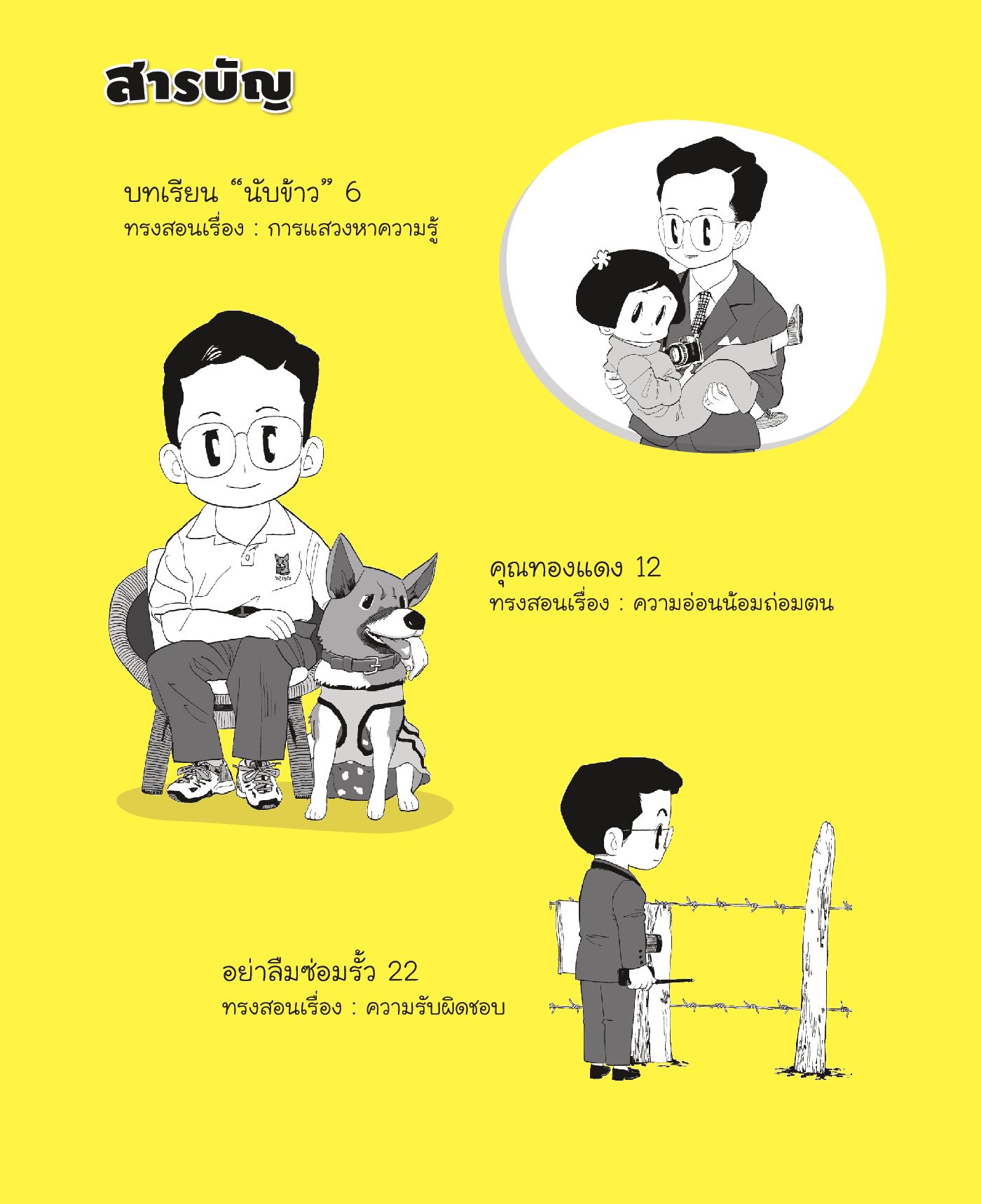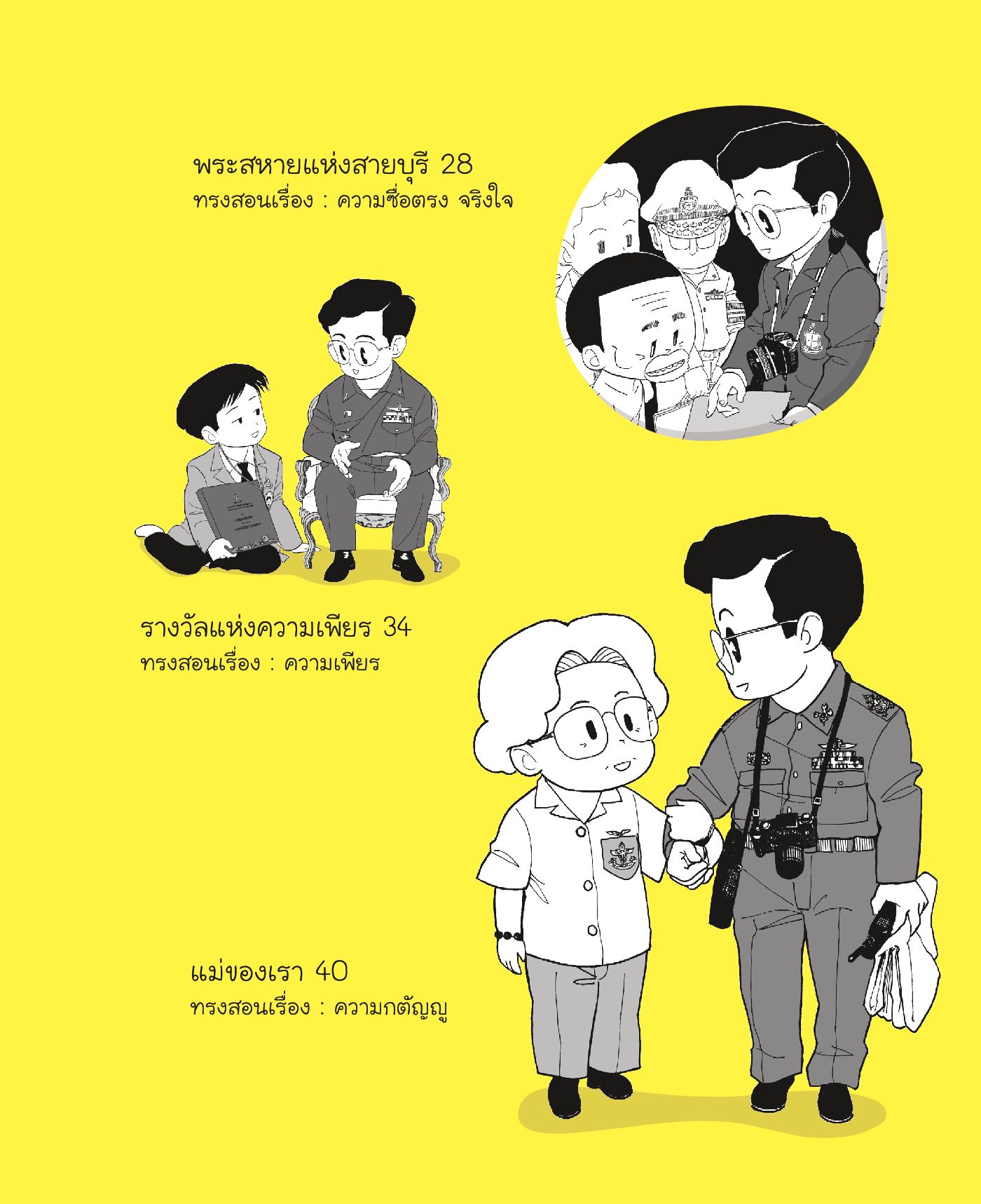 เรื่องเล่าเกี่ยวกับพระอารมณ์ขันของพระบาทสมเด็จพระปรมินทรมหาภูมิพลอดุลยเดช ที่สอดแทรกคติและพระบรมราโชวาทอ่านง่ายได้ความรู้ และสามารถน้อมนำไปประพฤติ ปฏิบัติ ก้าวตามรอยพระบาทอย่างภาคภูมิใจ เพราะในทุกก้าวย่างที่ทรงพระราชดำเนินไปเปี่ยมด้วยพระเมตตาและพระมหากรุณาธิคุณอันหาที่สุดมิได้