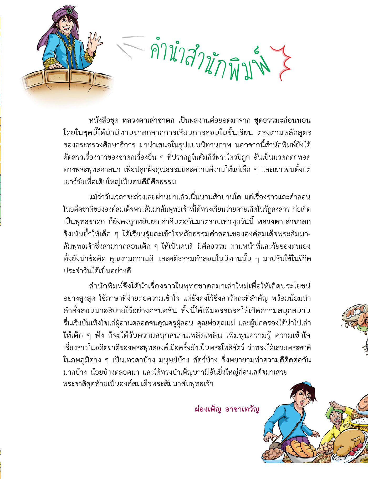 “การมีสติตั้งมั่น ไม่ปล่อยให้ความโลภเข้าครอบงำ จำนำมาซึ่งประโยชน์สุขแก่ตน” เรื่องราวของบรรดาพ่อค้าที่โลภมากคิดจะตัดโค่นต้นไทรที่ให้ร่มเงา ให้น้ำ อาหาร สาวงาม และสมบัติมากมาย แต่มีผู้รอดชีวิตมาได้ เพราะรู้จักสำนึกบุญคุณแม้เพียงต้นไทร