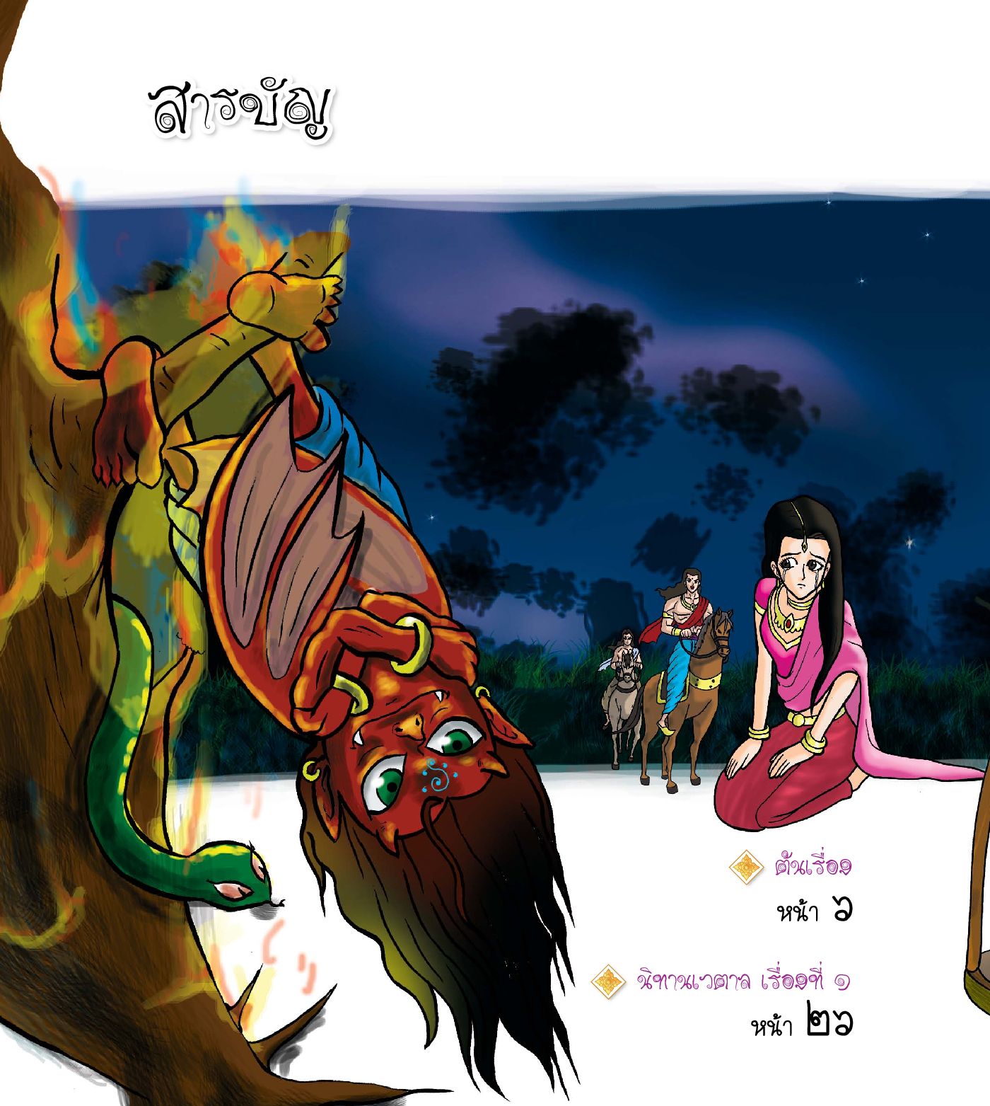 นิทานเรื่องที่ 1-4 เมื่อพระวิกรมาทิตย์แห่งกรุงอุชชยินีและพระโอรสต้องเดินทางติดตามหาเวตาลปีศาจร่างกายกึ่งมนุษย์กับค้างคาว ซึ่งต้องใช้ความเพียรพยายาม อดทนอดกลั้น ใช้สติประกอบปัญญาในการแก้ปัญหาโต้ตอบปริศนาของเวตาล