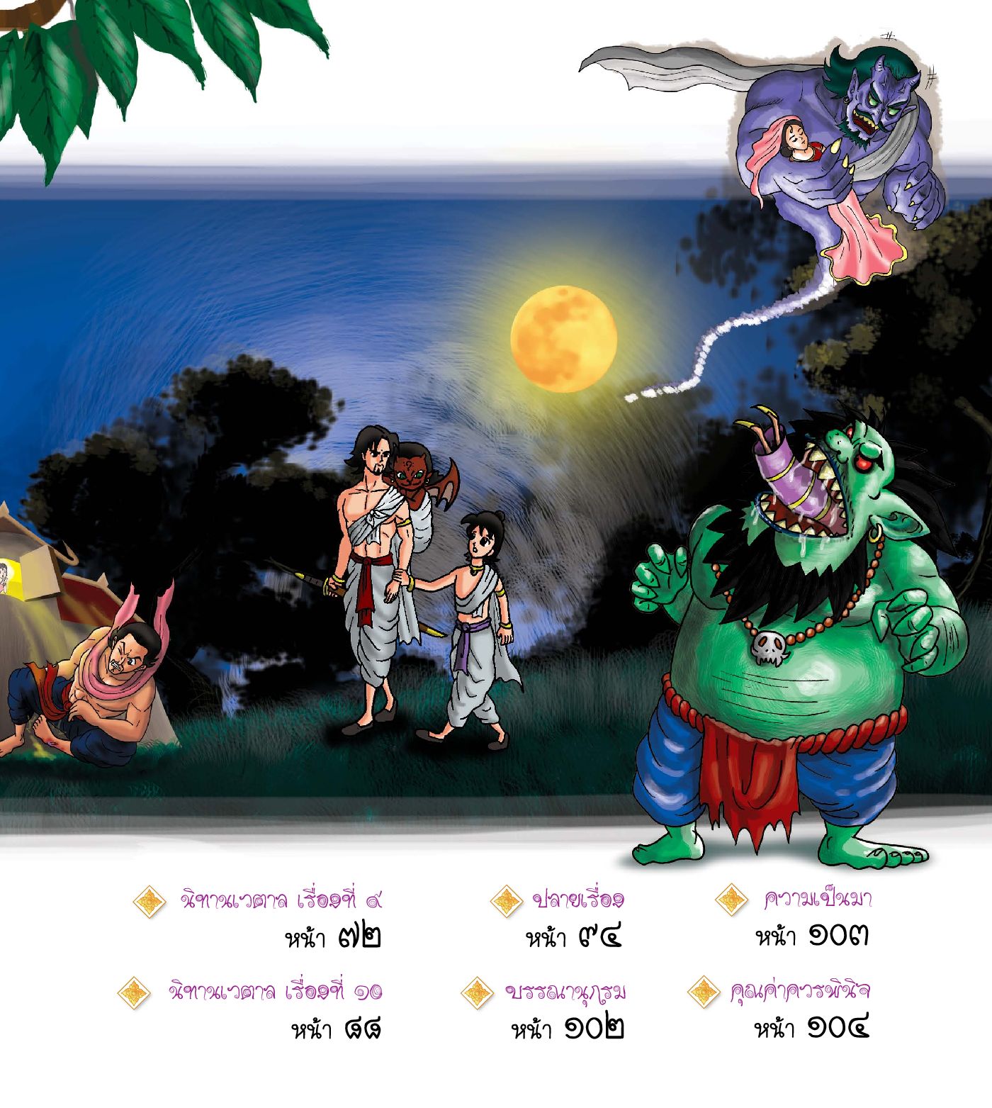 นิทานเรื่องที่ 5-10 เมื่อเวตาลปิศาจร่างกายกึ่งมนุษย์กับค้างคาวทูลยั่วพระวิกรมาทิตย์และพระโอรสให้ทรงขบคิดตอบปัญหา พระองค์จึงใช้สติประกอบปัญญาทำให้เวตาลเปลี่ยนใจและรอดชีวิตมาได้