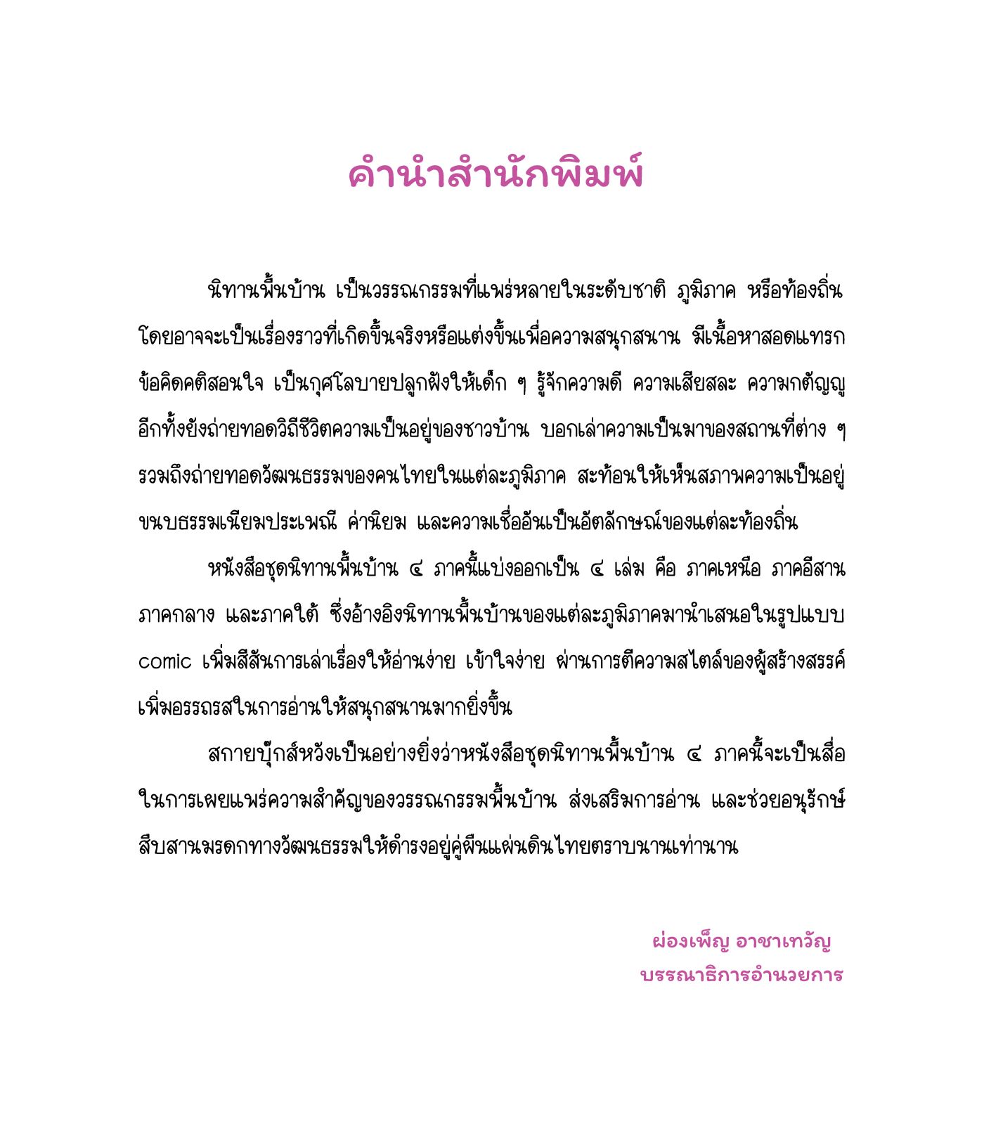 "นิทานพื้นบ้านภาคเหนือ" (comic) รวมเรื่องเล่าขานตำนานท้องถิ่นไทยในภาคเหนือที่รู้จักกันดี ในเล่มมี 7 เรื่อง ได้แก่ เหล็กน้ำพี้ เมืองลับแล จักจั่นไม่มีไส้ คดกับซื่อ คนคิดมาก พระธาตุหริภุญชัย และผานางคอย นำมาเล่าในรูปแบบ comic เนื้อหาสนุกสนาน สอดแทรกข้อคิดคติสอนใจ สะท้อนให้เห็นสภาพความเป็นอยู่ ขนบธรรมเนียมประเพณี ค่านิยม และความเชื่ออันเป็นอัตลักษณ์ของชาวไทยในภาคเหนือ