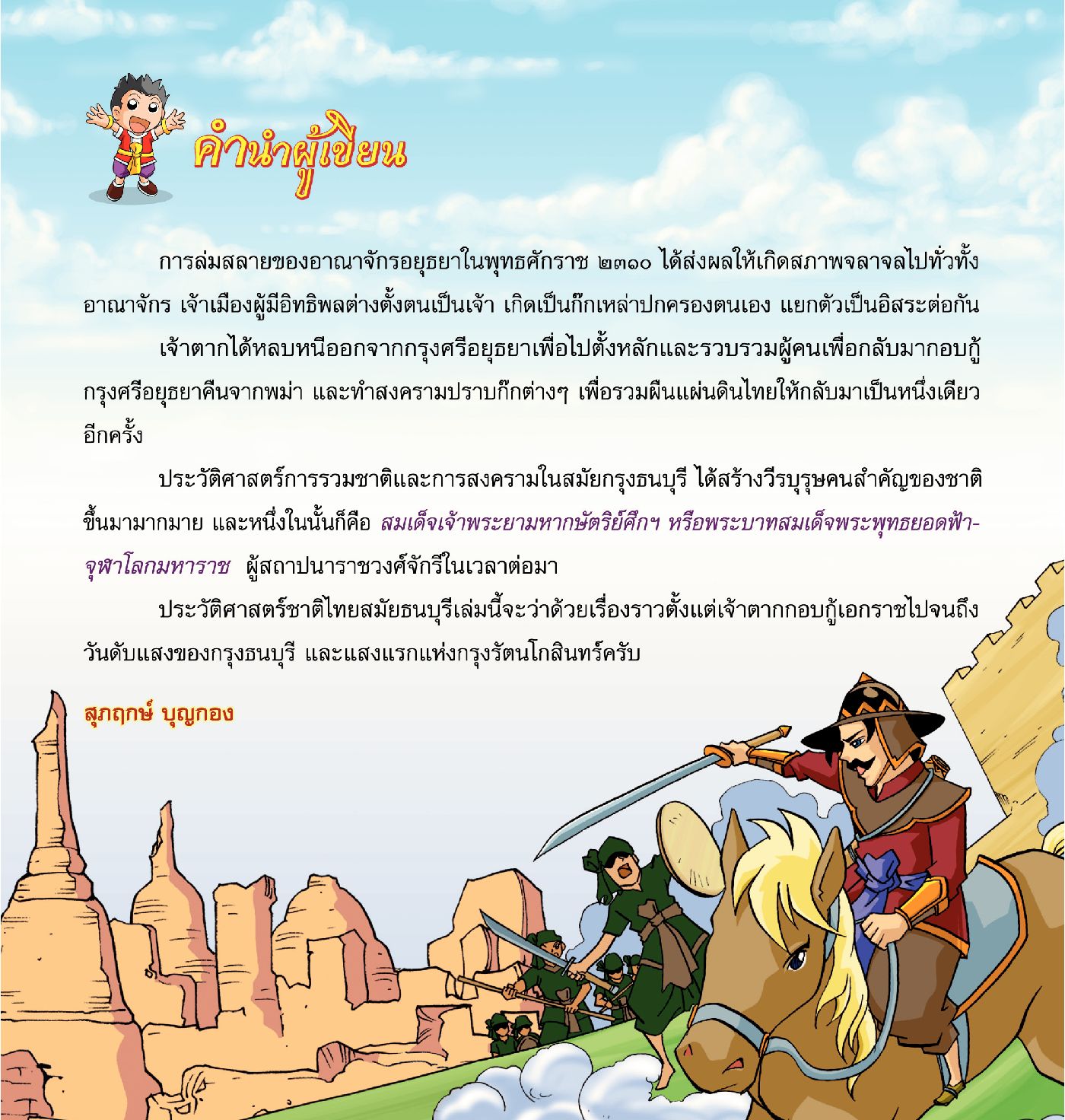 ประวัติศาสตร์ชาติไทย สมัยธนบุรี (ฉบับการ์ตูน)เมื่อสมเด็จพระเจ้าตากสินมหาราชทรงกอบกู้เอกราชคืนจากพม่าหลังจากเสียกรุงเป็นครั้งที่ 2 พระองค์ได้รวบรวมแผ่นดินจนเป็นปึกแผ่น สยามประเทศจึงกลับคืนสู่ความร่มเย็นอีกครั้ง
