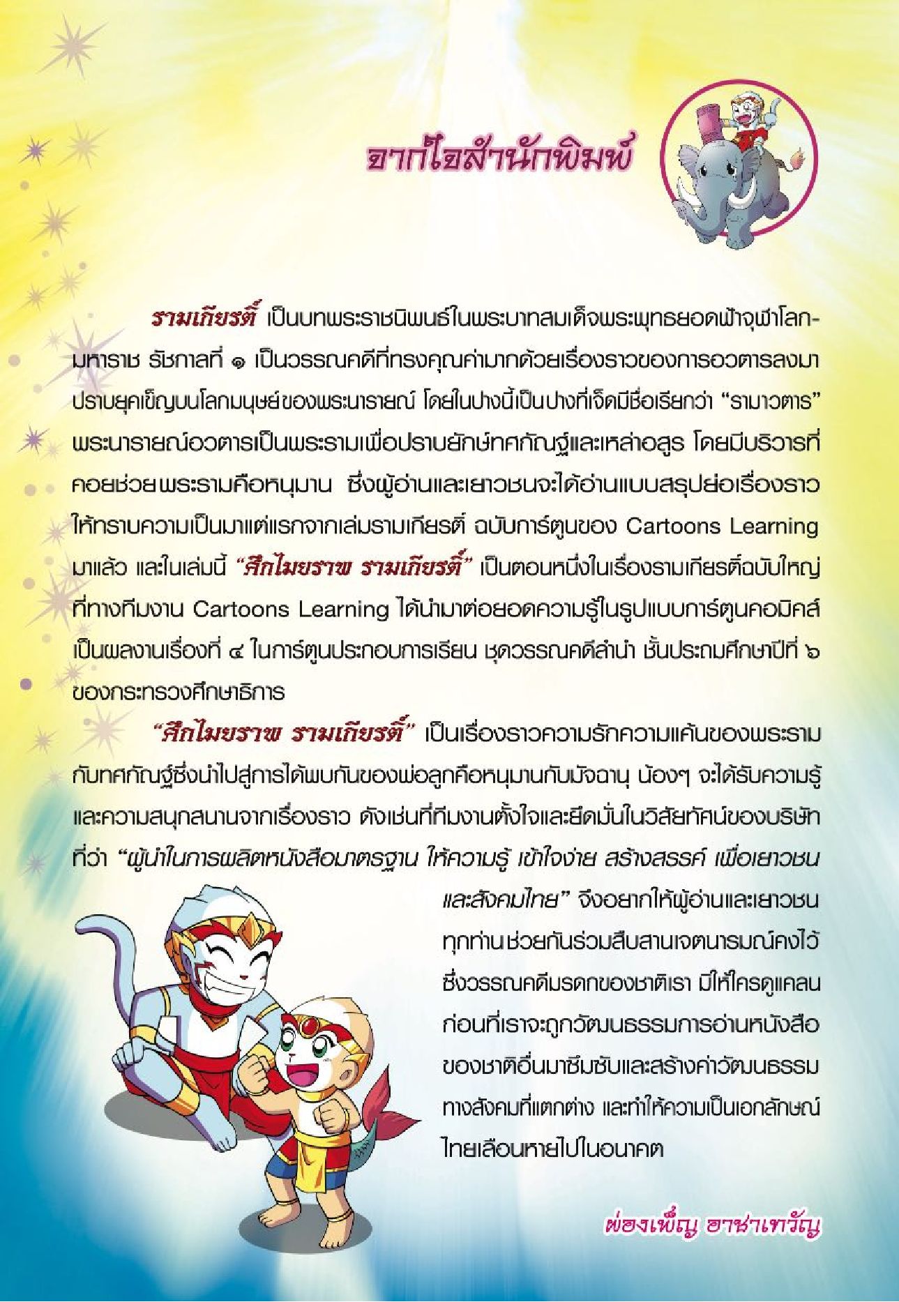 มหากาพย์แห่งการต่อสู้ระหว่างธรรมะและอธรรม ความถูกต้องความผูกพันระหว่างเลือดเนื้อเชื้อไขและความกตัญญูกตเวที...พบกับการ์ตูนความรู้แสนสนุกรามเกียรติ์ ตอน "ศึกไมยราพ" ซึ่งเป็นเหตุการณ์ที่พระรามถูกไมยราพเจ้าเมืองบาดาลลักพาตัวไป งานนี้ได้ทหารเอกของพระรามซึ่งก็คือ "หนุมาน" เป็นผู้อาสาไปช่วยนำพระรามกลับมาให้จงได้ ตอนนี้เป็นการนำวรรณคดีมาดัดแปลงเป็นการ์ตูนเพื่อให้เยาวชนได้ศึกษาอีกรูปแบบหนึ่ง เพื่อความบันเทิงและเข้าใจเนื้อหามากยิ่งขึ้น!สารบัญตอน 1 ไมยราพสะกดทัพตอน 2 หนุมานหักด่านไมยราพตอน 3 หนุมานพบมัจฉานุตอน 4 หนุมานลอบเข้าวังไมยราพตอน 5 หนุมานปะทะไมยราพ