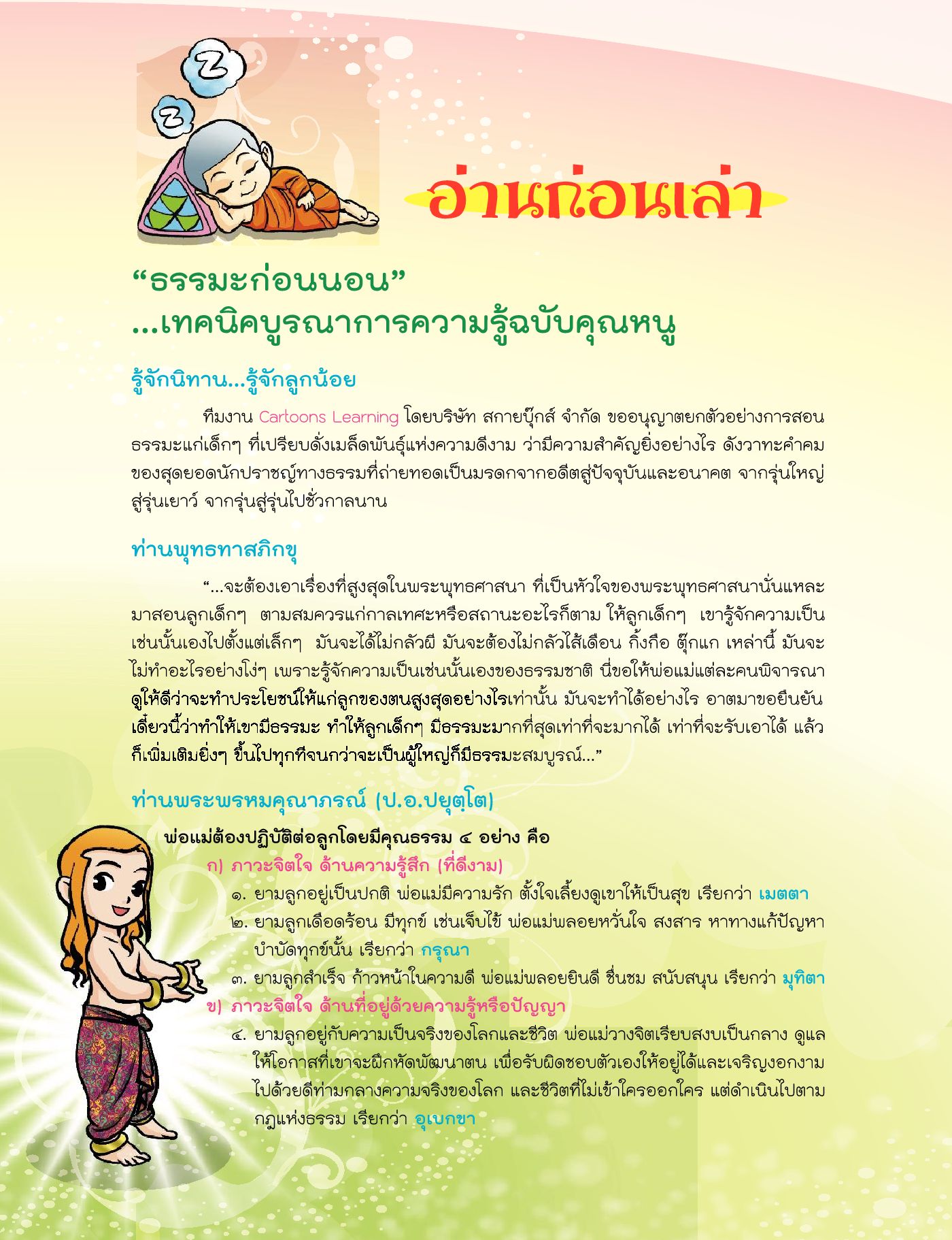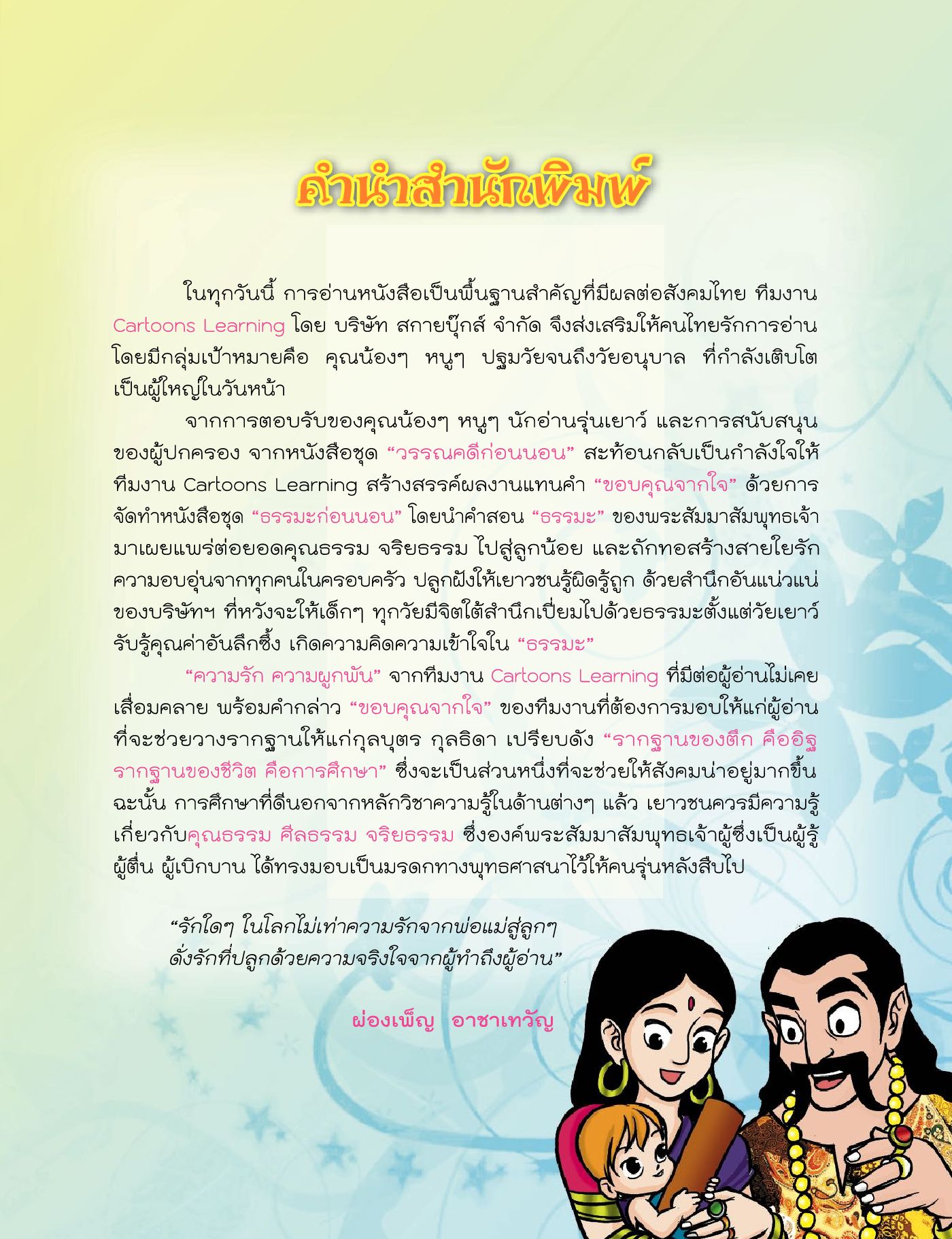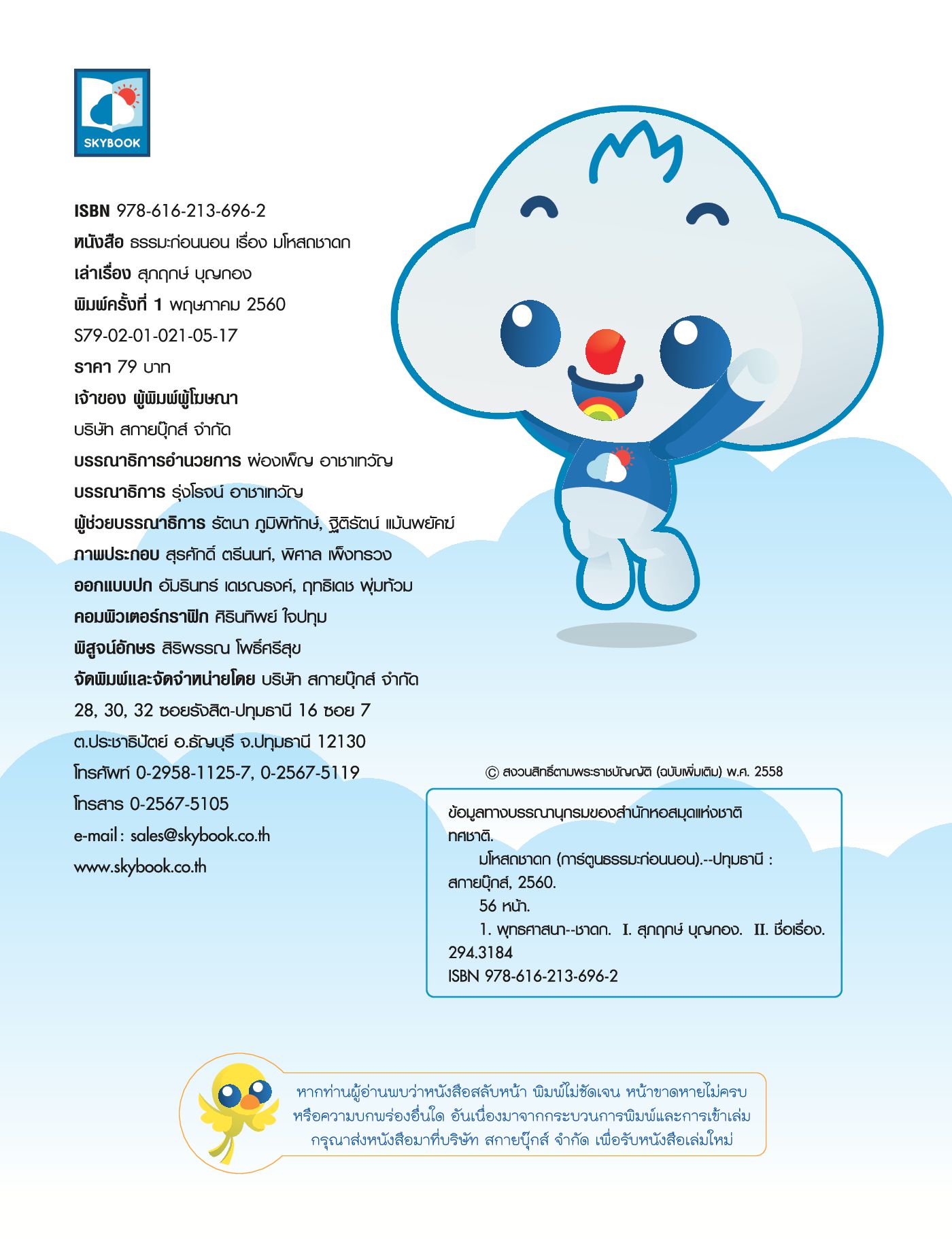 ธรรมะก่อนนอน เรื่อง มโหสถชาดกปัญญาอันล้ำเลิศย่อมให้คุณแก่บุคคลยิ่งกว่ามีทรัพย์นับแสน แม้มีปัญญาดั่งปราชญ์ แต่ถ้าเป็นผู้รู้จักคิดให้รอบคอบ ก็เป็นผู้มีปัญญาและประพฤติชอบ พบกับธรรมะก่อนนอน เรื่อง "มโหสถชาดก" ในรูปแบบนิทานอ่านเพลิน ซึ่งเป็นหนึ่งในทศชาติชาดก ชาติที่ 5 ในการบำเพ็ญปัญญาบารมีของพระพุทธเจ้า เมื่อครั้งเสวยพระชาติเป็นพระโพธิสัตว์ ในเล่มเต็มไปด้วยเรื่องราวที่สนุกสนานและให้คุณค่า แฝงคติธรรม เพื่อเป็นแนวทางในการปฏิบัติและดำเนินชีวิตไปสู่ความดีและความสุข ตลอดจนกระชับความสัมพันธ์ในครอบครัว