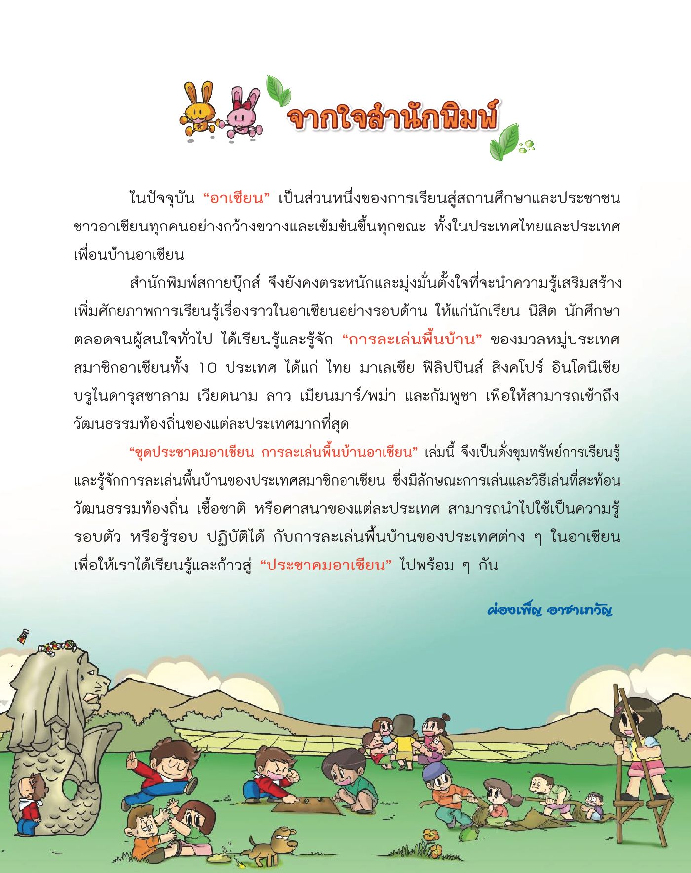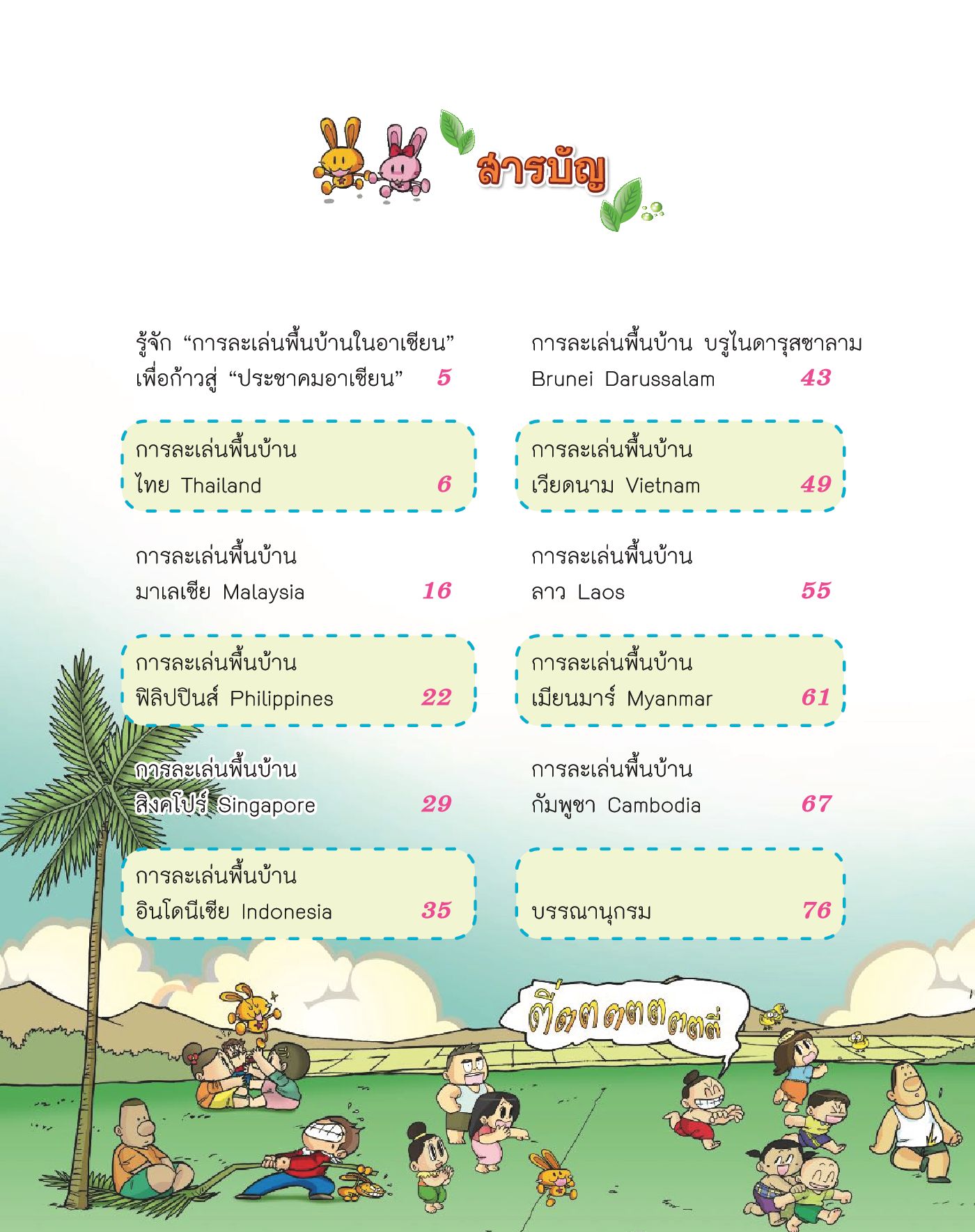 รวบรวมการละเล่นพื้นบ้านของประเทศสมาชิกอาเซียนทั้ง 10 ประเทศ รวมทั้งลักษณะการเล่นและวิธีเล่นอย่างครบถ้วน