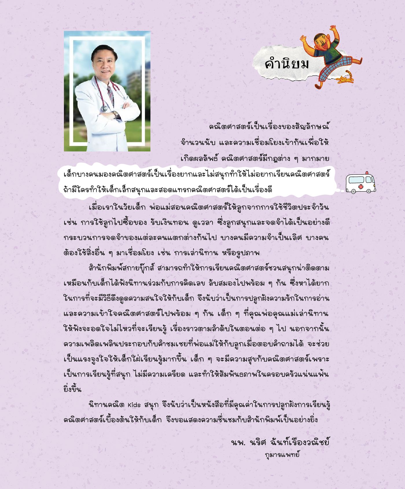 นิทานคณิต Kids สนุก จะช่วยเสริมสร้างความรู้ความเข้าใจเกี่ยวกับคณิตศาสตร์ เพื่อให้เด็ก ๆ ที่ไม่ชอบวิชาคณิตศาสตร์ได้ทำความคุ้นเคยกับการบวกการลบ การคูณและการหาร รูปร่าง รูปทรง การจำแนก เปรียบเทียบ สถิติและค่าเฉลี่ย ผ่านเรื่องเล่าแสนสนุกสอดแทรกความรู้ในวิชาคณิตศาสตร์ไว้อย่างแยบยล และช่วยพัฒนาความคิดสร้างสรรค์อย่างดีเยี่ยมสารบัญ : นิทานคณิต Kids สนุก เล่ม 2พบกับคณิตศาสตร์ทักทายคณิตศาสตร์ผูกมิตรกับคณิตศาสตร์เล่นกับคณิตศาสตร์