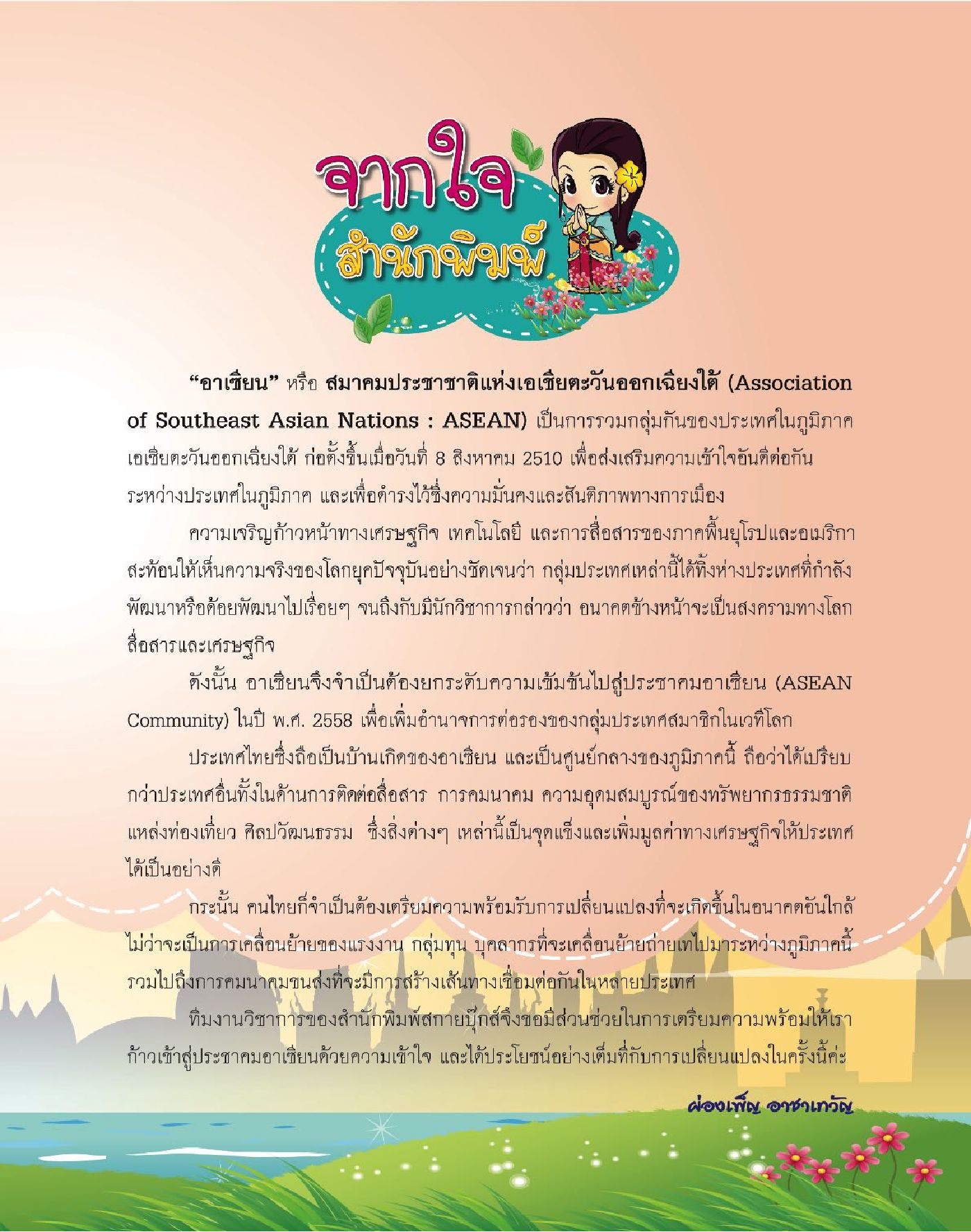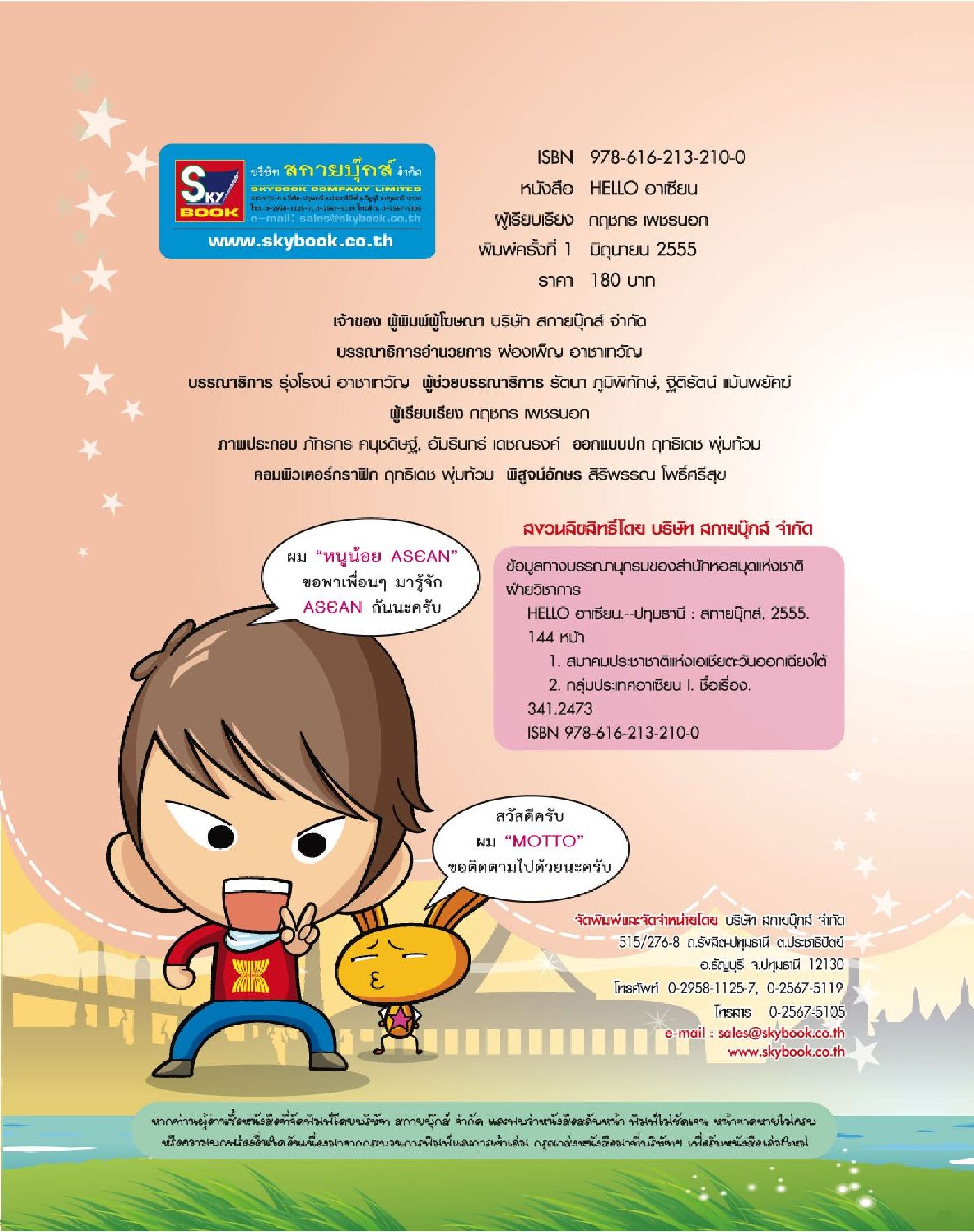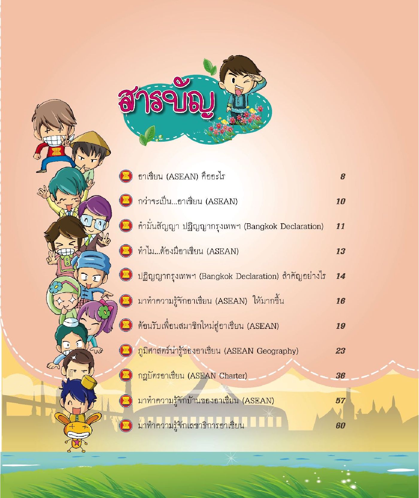 Hello อาเซียน ชุดประชาคมอาเซียน ฉบับการ์ตูนเรียนรู้ รู้จัก และเสริมสร้างความรู้เกี่ยวกับอาเซียนอย่างหลากหลาย ทุกแง่มุมทั้งประวัติความเป็นมาของอาเซียน ประเทศสมาชิก ภาษา วัฒนธรรม ประเพณีธรรมเนียมปฏิบัติต่างๆ และความรู้เกี่ยวกับประชาคมอาเซียนเพื่อเตรียมความพร้อมเข้าสู่สังคม “ประชาคมอาเซียน” ด้วยความเข้าใจและได้รับประโยชน์อย่างเต็มที่