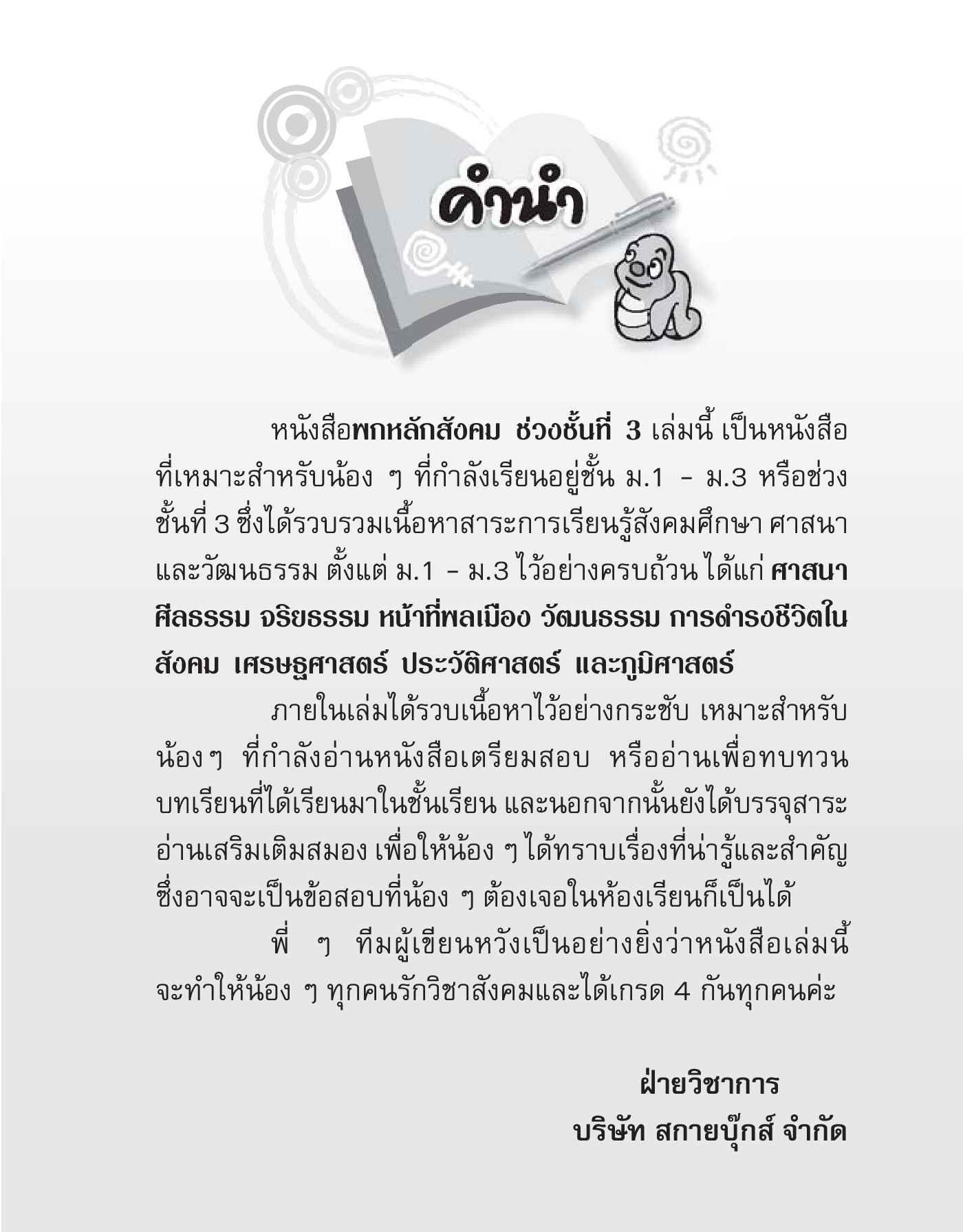 พกหลักสังคม ช่วงชั้นที่ 3 เหมาะสำหรับน้องๆที่กำลังเรียนอยู่ชั้นม.1-ม.3 หรือช่วงชั้นที่ 3 ซึ่งได้รวบรวมเนื้อหาสาระการเรียนรู้สังคมศึกษา ศาสนา และวัฒนธรรม ตั้งแต่ม.1-ม.3 ไว้อย่างครบถ้วน ได้แก่ ศาสนา ศีลธรรม จริยธรรม หน้าที่พลเมือง วัฒนธรรม การดำรงชีวิตในสังคม เศรษฐศาสตร์ ประวัติศาสตร์ และภูมิศาสตร์...