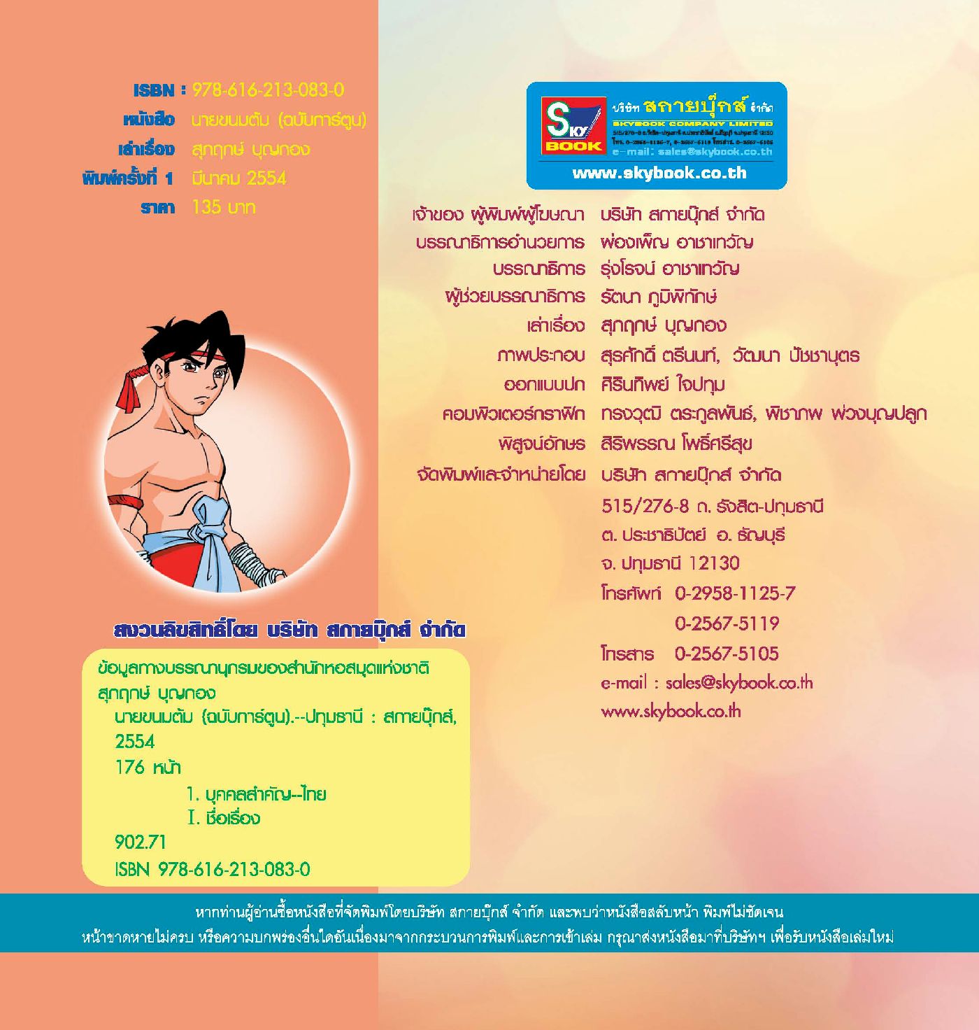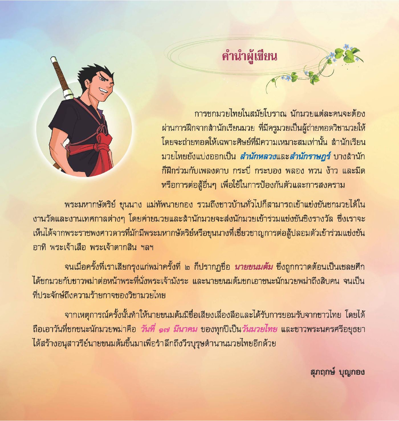 "นายขนมต้ม (ฉบับการ์ตูน)" เล่มนี้ได้รวบรวมเรื่องราวประวัติศาสตร์ของการชกมวยไทยในสมัยโบราณ พงศาวดารพม่าเล่าว่า นายขนมต้มเป็นชาวไทยที่ถูกเกณฑ์ไปเป็นเชลยศึกที่พม่า และได้ขึ้นชกมวยกับทหารพม่าในงานฉลองเจดีย์ชเวดากอง ซึ่งนายขนมต้มสามารถเอาชนะนักมวยพม่าได้ถึง 10 คนโดยไม่มีการหยุดพัก การชกครั้งนี้ถือเป็นการเผยแพร่ศิลปะมวยไทยให้โลกรู้เป็นครั้งแรก ดังนั้นนายขนมต้มจึงเปรียบเสมือนบิดาแห่งมวยไทยตั้งแต่นั้นเป็นต้นมา จากเหตุการณ์ครั้งนั้นทำให้นายขนมต้มมีชื่อเสียงเลื่อลือเเละได้รับยอมรับจากชาวไทย โดยได้ถือเอาวันที่ชกชนะนักมวยพม่าคือ วันที่ 17 มีนาคม ของทุกปีเป็น วันมวยไทย เเละชาวพระนครศรีอยุธยาได้สร้างอนุสาวรีย์นายขนมต้มมาเพื่อรำลึกถึงวีรบุรุษตำนานมวยไทยอีกด้วย