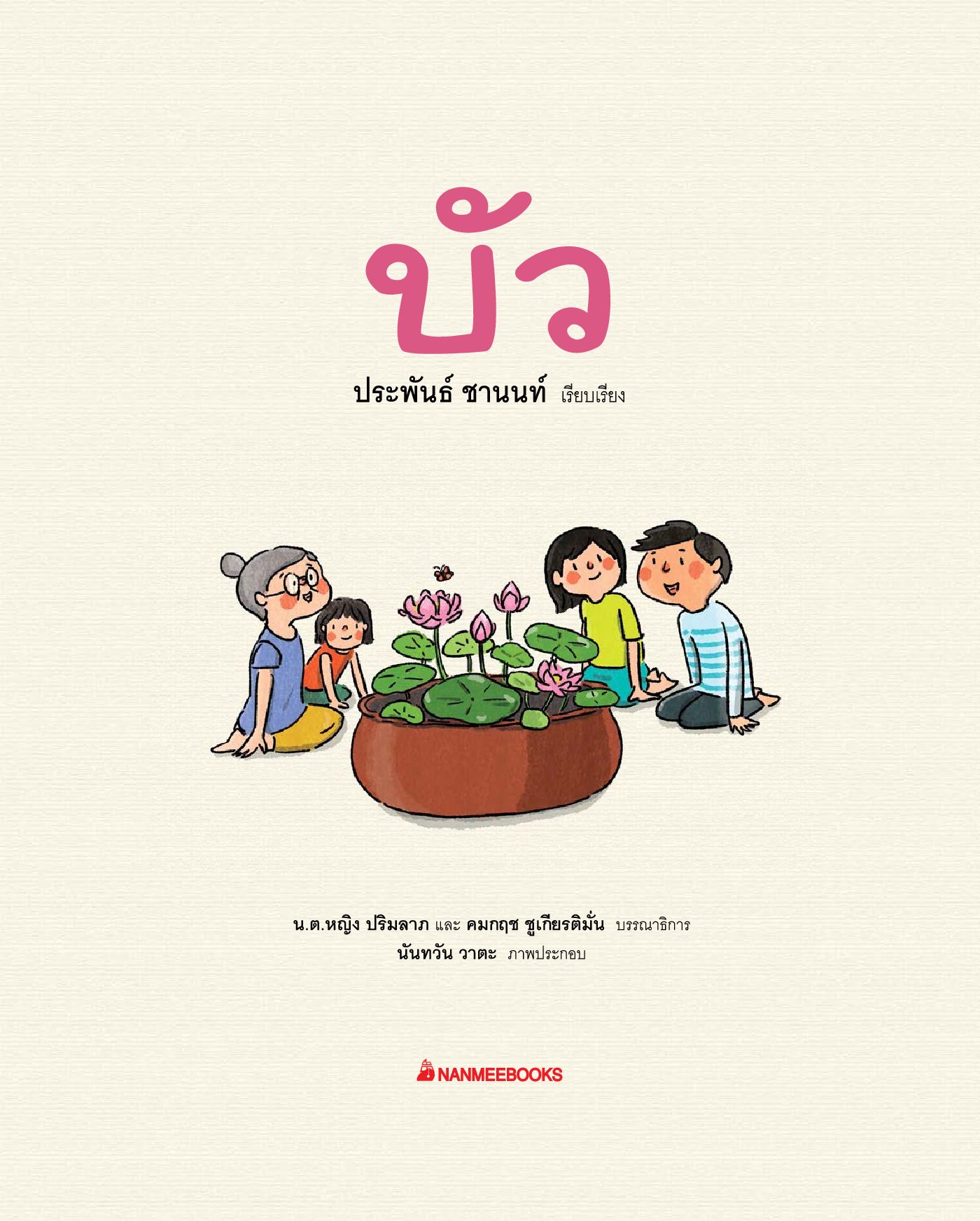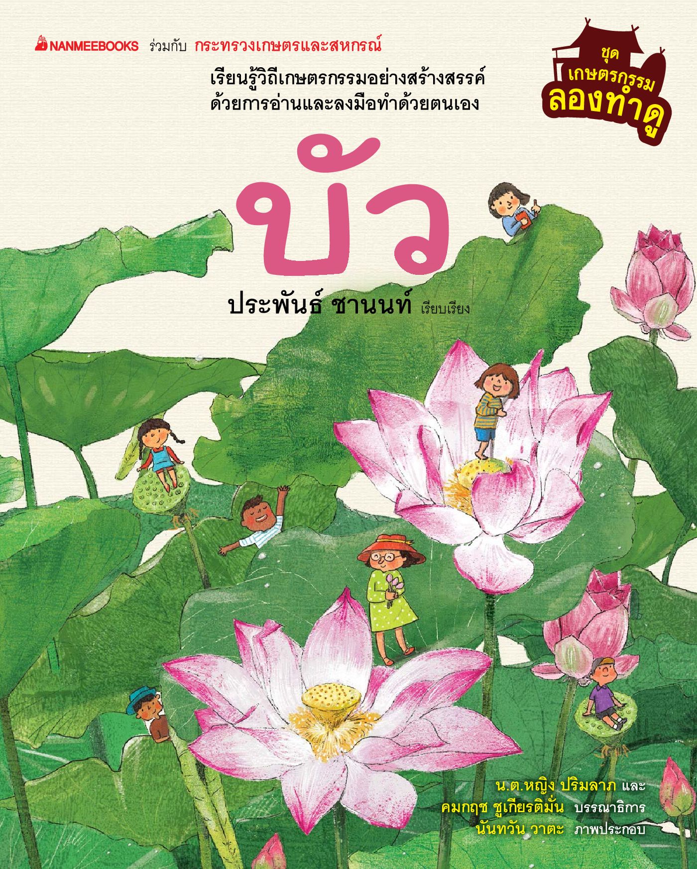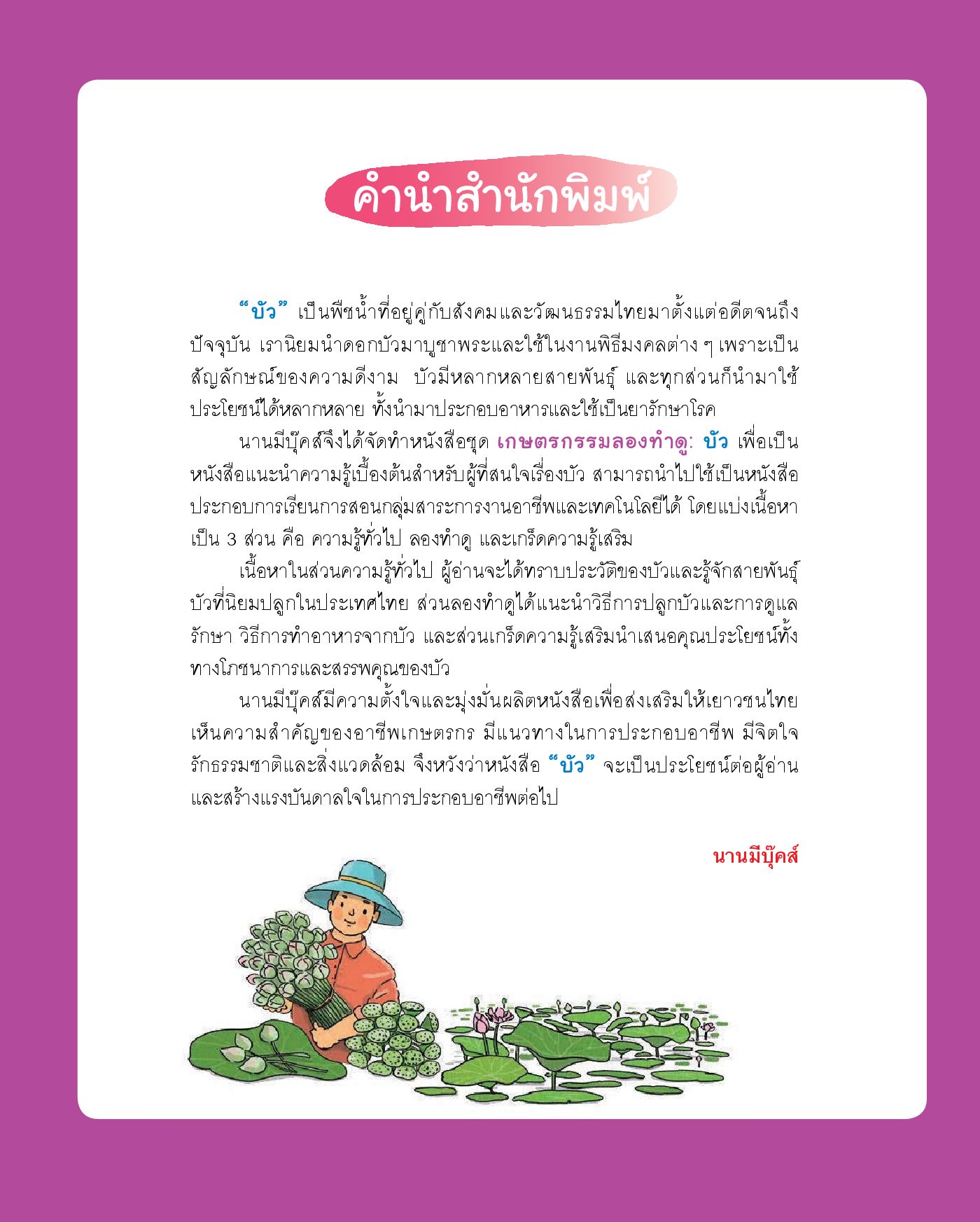 คู่มือการปลูกบัวสำหรับเยาวชนและผู้ที่สนใจทั่วไป เน้นการนำเสนอด้วยภาพถ่ายและภาพวาด ให้ความรู้เกี่ยวกับลักษณะของบัวหลวงและบัวสาย รู้จักชนิดของบัวที่นิยมปลูกในประเทศไทย แนะนำวิธีปลูก เริ่มตั้งแต่การเตรียมอุปกรณ์และพื้นที่ ขั้นตอนการปลูกบัวในกระถาง ขั้นตอนการปลูกในสระ วิธีบำรุงดูแล เมนูอาหารจากบัวที่ทำได้ง่ายๆ รวมทั้งเกร็ดความรู้เสริม เช่น คุณประโยชน์จากส่วนต่าง ๆ ของบัว