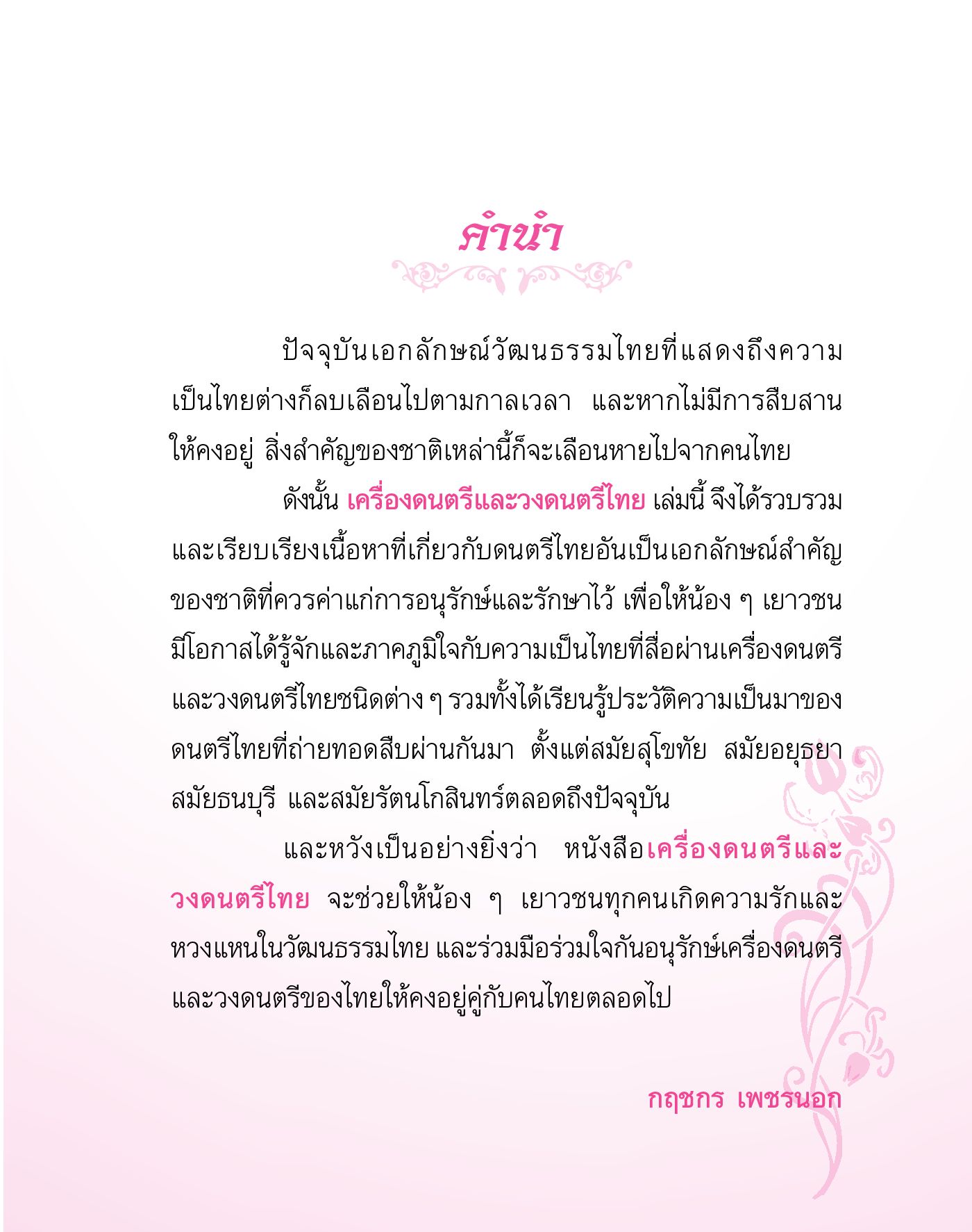 ให้เนื้อหาที่สำคัญเกี่ยวกับเครื่องดนตรีและวงดนตรีไทย อันเป็นเอกลักษณ์สำคัญของชาติที่ควรค่าแก่การอนุรักษ์ไว้ เพื่อให้น้องๆ เยาวชนได้มีโอกาสได้รู้จักและภาคภูมิใจกับความเป็นไทยที่สื่อผ่านเครื่องดนตรีและวงดนตรีไทยชนิดต่างๆ รวมทั้งได้เรียนรู้ประวัติความเป็นมาของดนตรีไทย ที่ถ่ายทอดสืบผ่านกันมาตั้งแต่สมัยสุโขทัย สมัยอยุธยา สมัยธนบุรี และสมัยรัตนโกสินทร์ ตลอดถึงปัจจุบัน