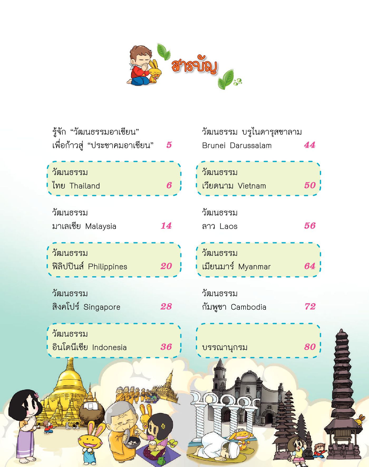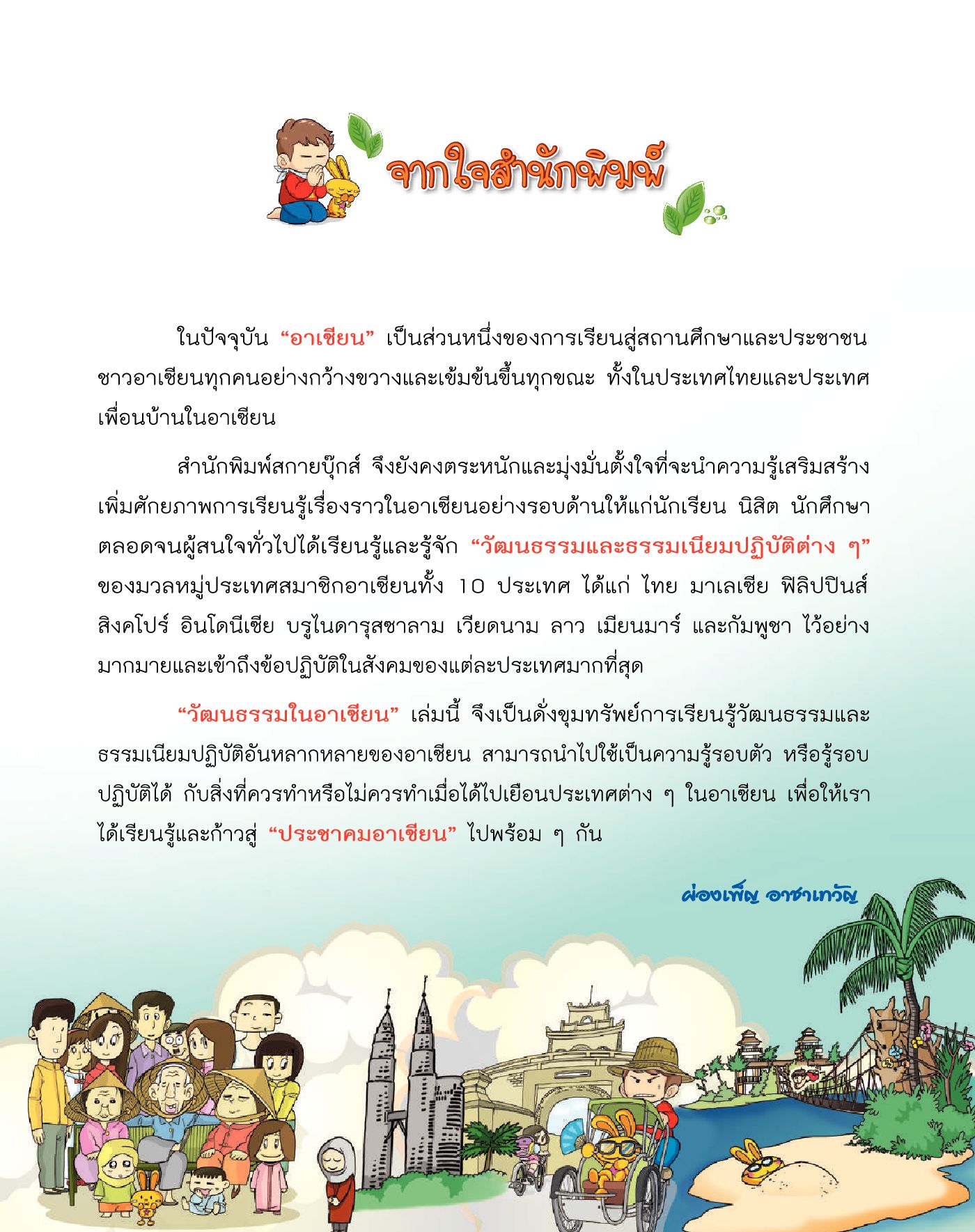 ช่วยน้องๆ เรียนรู้วัฒนธรรมและธรรมเนียมปฏิบัติอันหลากหลายของอาเซียน ผ่านเรื่องราวและภาพประกอบสุดน่ารัก ซึ่งสามารถนำมาใช้เป็นความรู้รอบตัว หรือรู้รอบปฏิบัตได้ กับสิ่งที่ควรทำหรือไม่ควรทำเมื่อได้ไปเยอนประเทศต่างๆ ในอาเซียน เพื่อให้เราได้เรียนรู้และก้าวสู่ "ประชาคมอาเซียน" ไปพร้อมๆ กัน