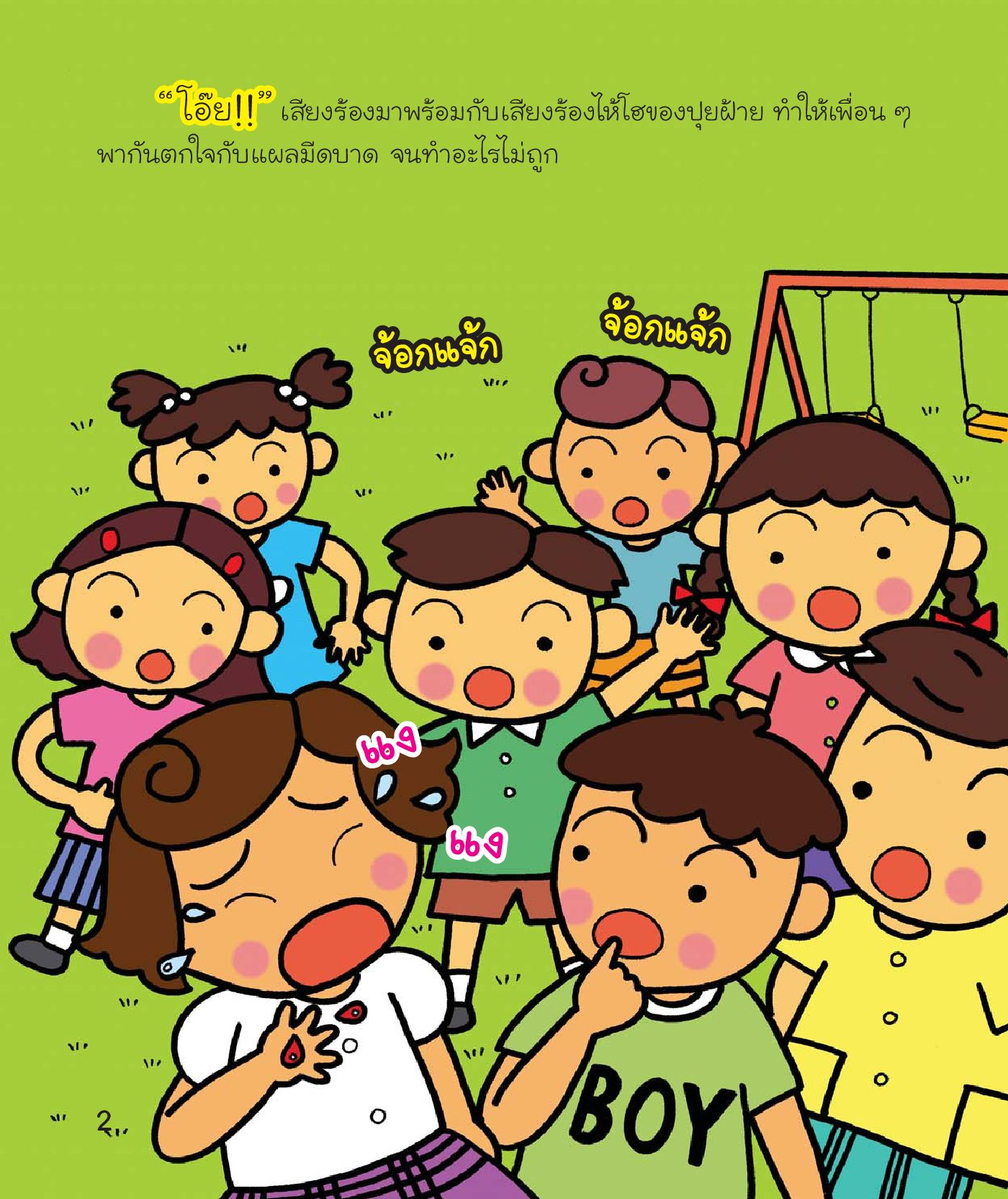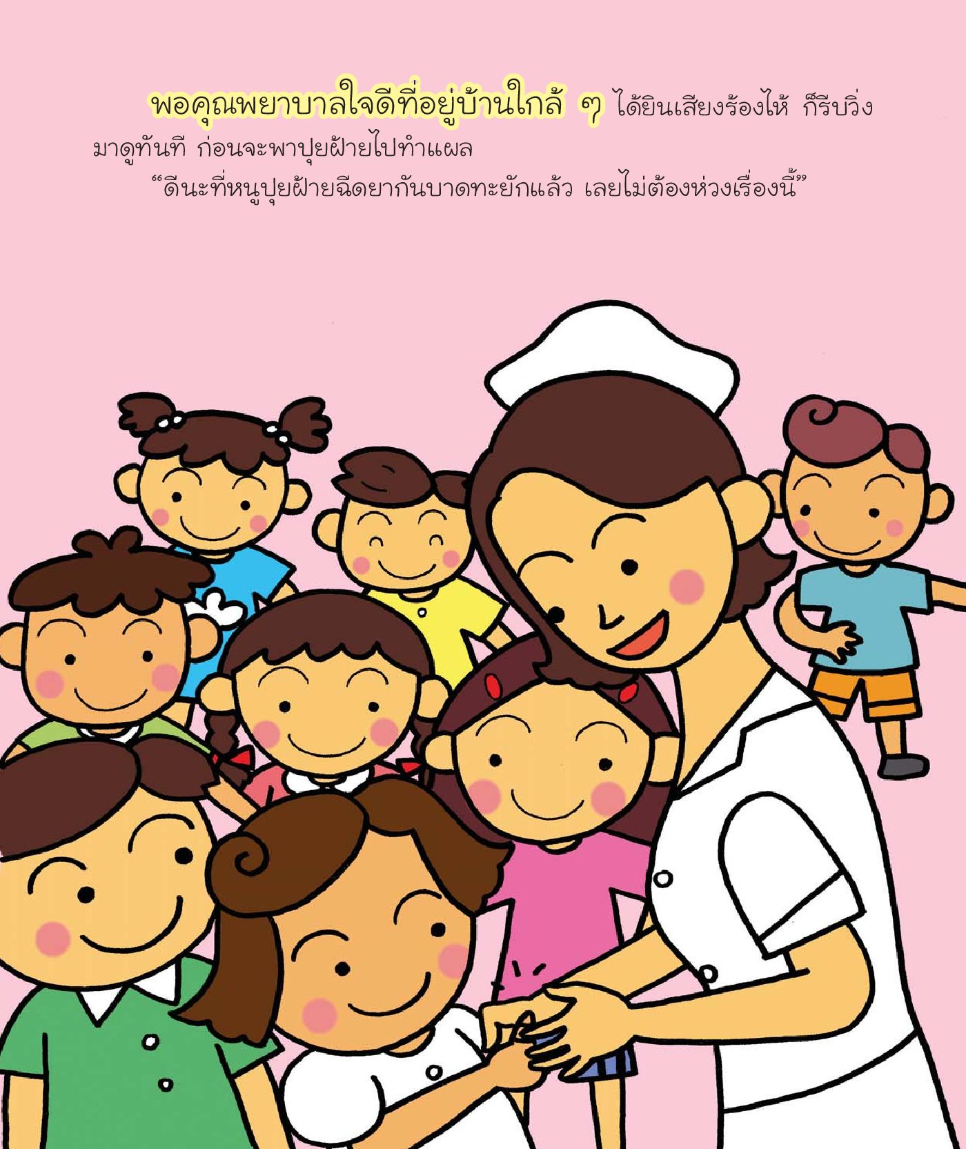 หนังสือภาพสำหรับเด็กให้ความรู้เรื่องการปฐมพยาบาล ปุยฝ้ายโดนมีดบาดเลือดออก เพื่อน ๆ พากันตกใจทำอะไรไม่ถูกจนคุณน้าพยาบาลบ้านข้าง ๆ ได้ยินเสียงร้องไห้จึงออกมาดูและทำแผลให้ จากนั้นคุณน้าเลยสอนเด็กเรื่องการปฐมพยาบาล เช่น อุปกรณ์ปฐมพยาบาล การปฐมพยาบาลเมื่อโดนตะปูตำ การปฐมพยาบาลเมื่อโดนน้ำร้อนลวก