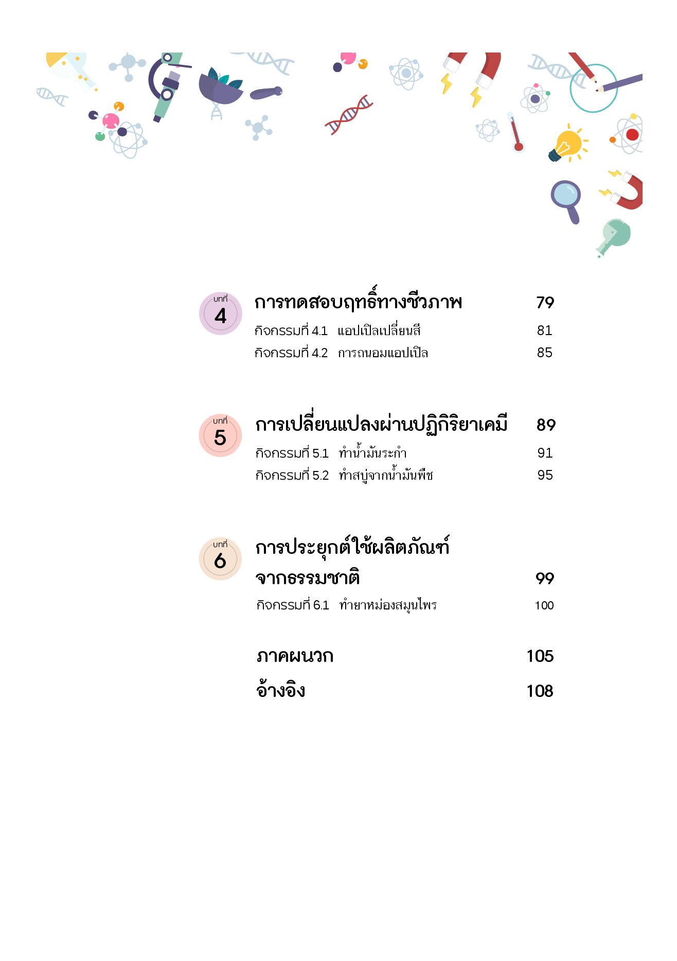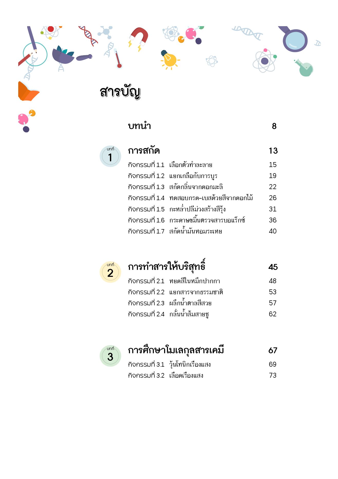 แนวทางการจัดกิจกรรมและเสริมการเรียนรู้การทดลองเคมีพื้นฐาน นำเสนอแนวคิดและกระบวนการวิจัย รวมถึงพัฒนาสารผลิตภัณฑ์ธรรมชาติ 6 ขั้นตอนหลัก ได้แก่ การสกัดสารตัวอย่าง การทำสารให้บริสุทธิ์ การศึกษาโมเลกุลสารเคมี การทดสอบฤทธิ์ทางชีวภาพ การเปลี่ยนแปลงผ่านปฏิกิริยาเคมีเพื่อพัฒนาประสิทธิภาพ และการนำไประยุกต์ใช้ประโยชน์ เหมาะสำหรับครูนำไปใช้ประกอบการสอนในห้องเรียนและผู้ที่ชื่นชอบการทดลอง